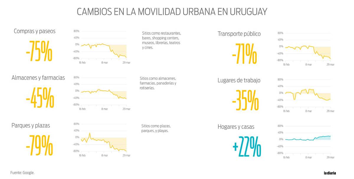 En todo Uruguay, Google constató que la gente está yendo 75% menos veces a los locales comerciales y a lugares de recreación desde el día 16 de febrero hasta el 29 de marzo, lapso de recolección de los datos. En cuanto a los supermercados, lugares de compra de alimentos y farmacias, la gente ha reducido sus visitas en un 45% en el mismo periodo antes mencionado.